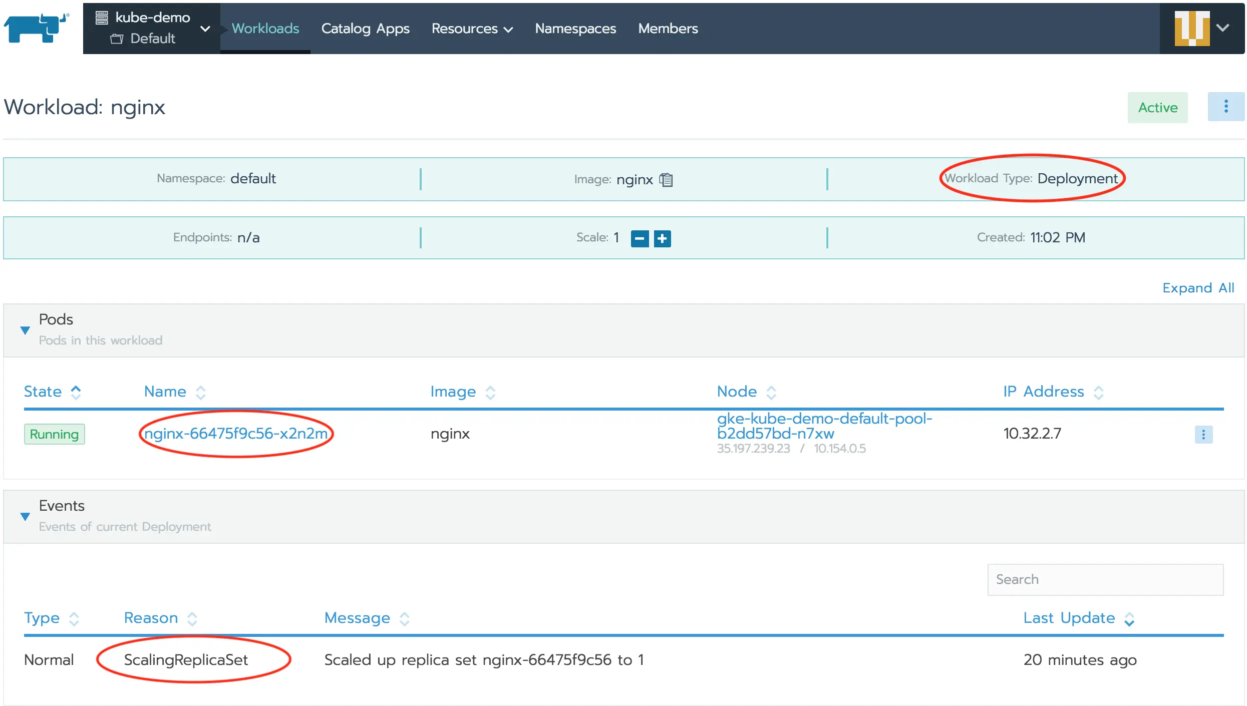 现在你有一个Deployment,它将确保我们所需的状态在集群中正确显示。现在,点击Scale附近+号,将此Workload扩容到3。一旦你这样做,你应该能立即看到另外2个Pods被创建出来,另外还多了2个ReplicaSet来缩放事件。使用Pod右侧菜单,尝试删除其中一个pod,并注意ReplicaSet是如何重新创建它以匹配所需状态的。