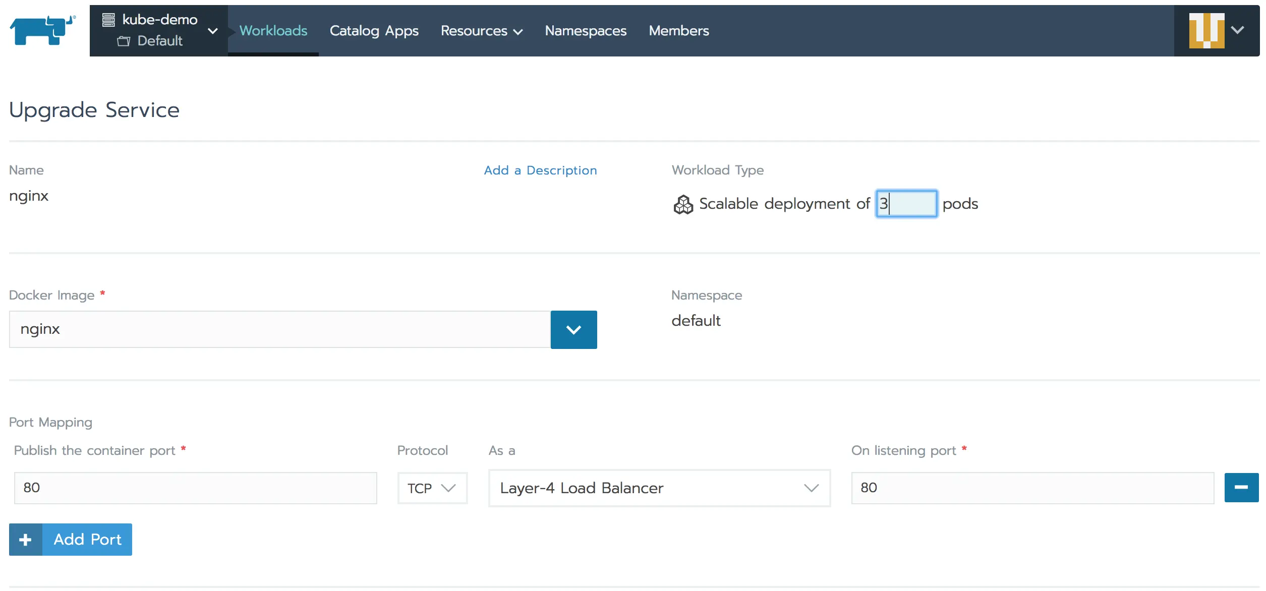 现在,您的应用程序已启动并运行,并且已经扩展到3个实例。下一个问题是,您如何访问它?在这里,我们将尝试使用下一个Kubernetes对象——服务。为了暴露我们的nginx工作负载,我们需要先编辑它,从Workload右侧菜单中选择Edit。您将看到Deploy Workload页面,且已填好了您的nginx工作负载的详细信息: