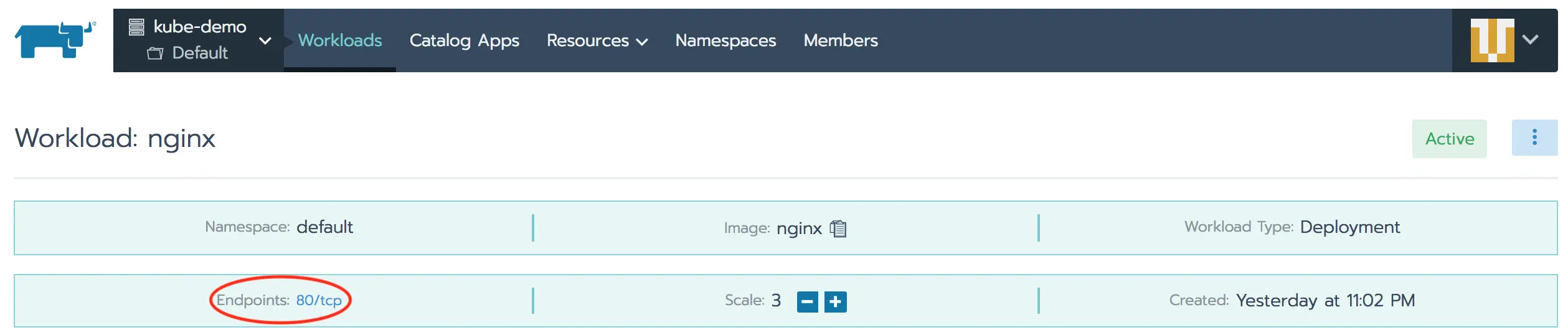 然后自信地点击Upgrade吧!这将在您的云提供商中创建一个外部负载均衡器,并将流量引至您的Kubernetes集群内的nginx Pods中。要对此进行测试,请再次访问nginx工作负载概述页面,现在您应该看到Endpoints旁的80/tcp链接: