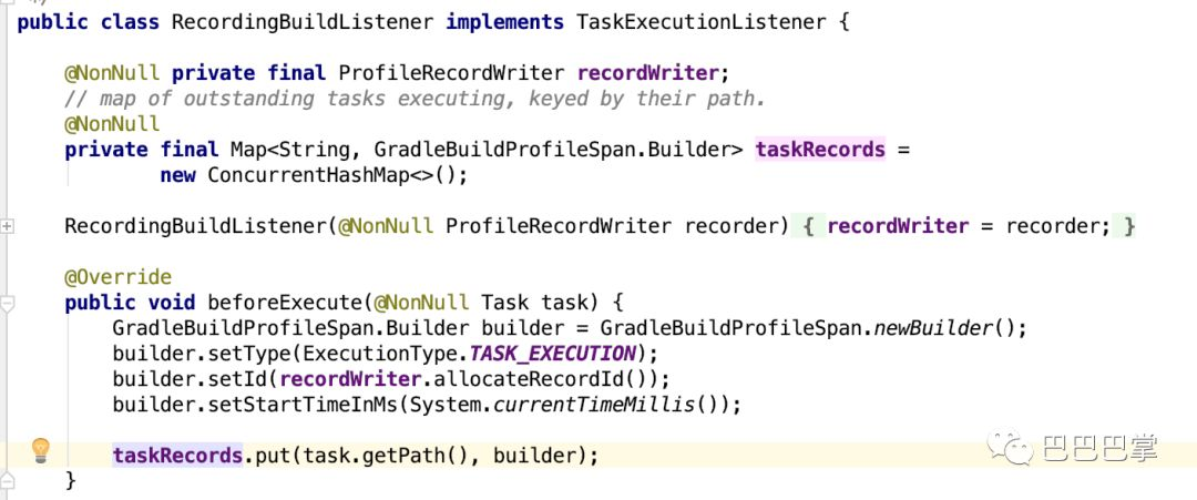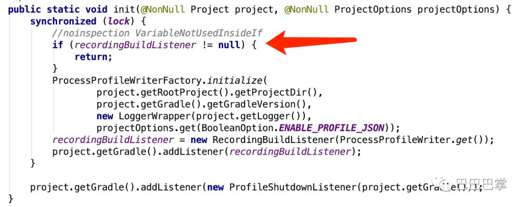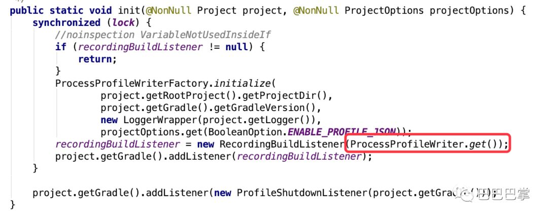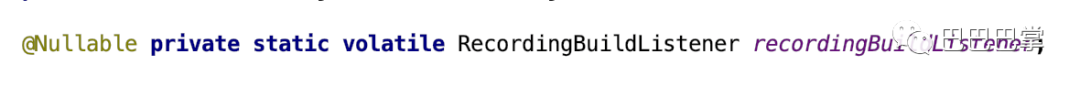 可以看到,如果不想走到下面的 ProcessProfileWriter.get() 的话,需要走进箭头位置的 if 就行,即 recordingBuildListener 需要不等于 null,来看看它是啥?