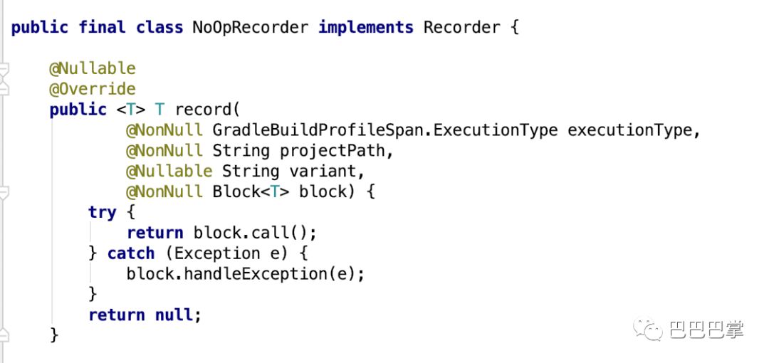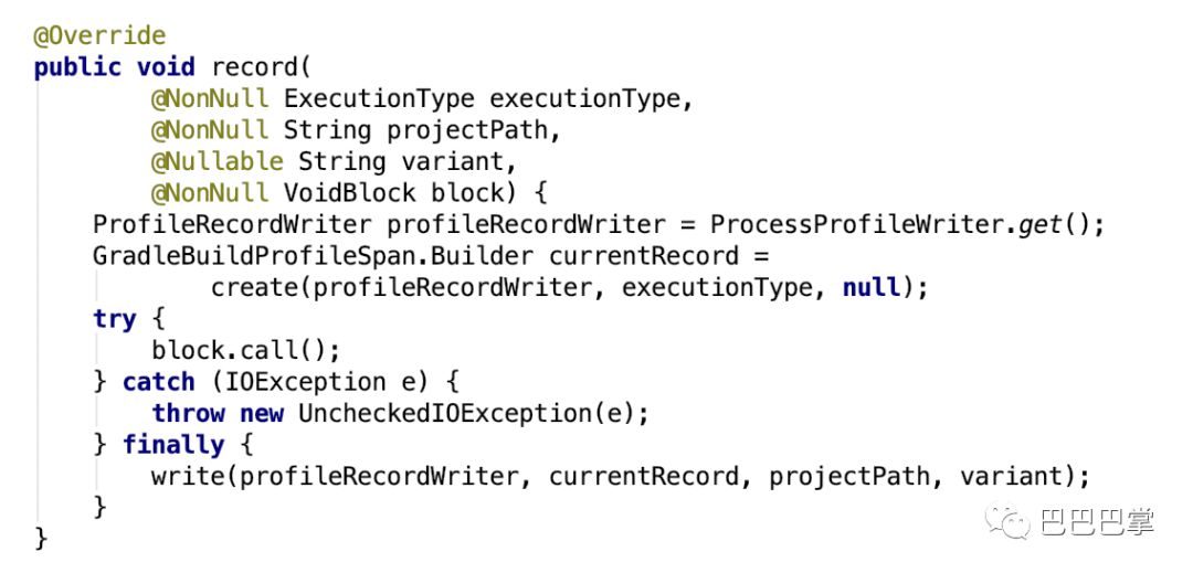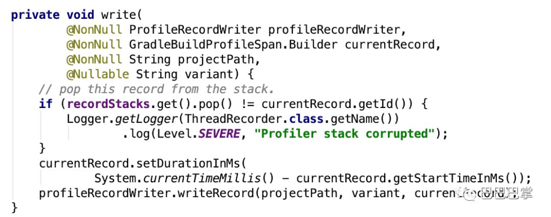 先来看看 4 ,threadRecorder.record 可谓是到处都是,贯穿着整个打包的执行,来看看他的具体实现,在 com.android.builder.profile.ThreadRecorder 里: