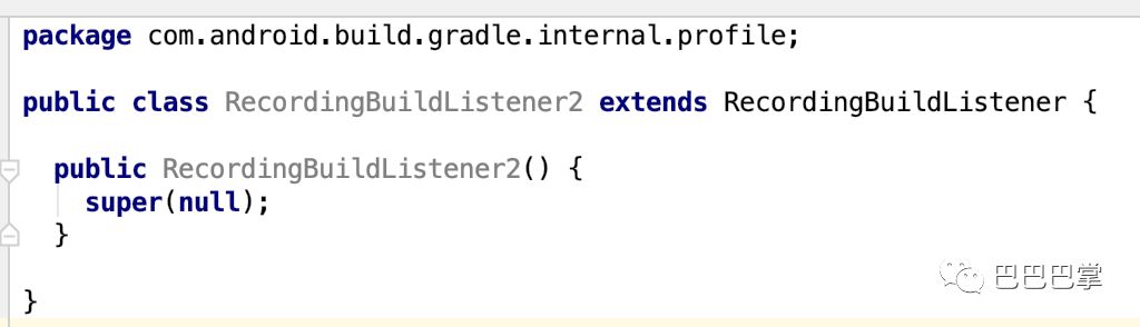 咦,有万恶的波浪线,原来是 RecordingBuildListener 的构造函数是包访问权限,所以没法在我的插件里初始化。不要紧,我建个一样的包名的类去继承它: