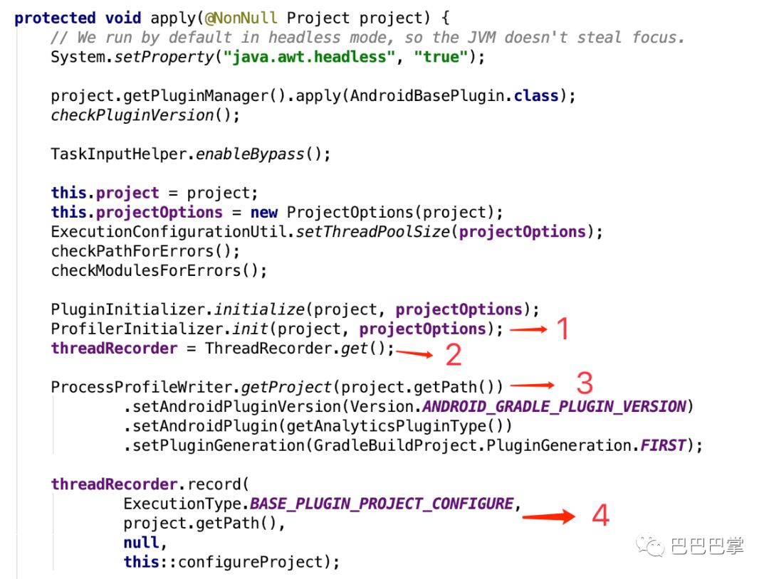 起源来自于 com.android.build.gradle.BasePlugin#apply() ,如下图涉及到了四个部分: