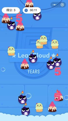 《LeanCloud 周年游戏》玩起来很简单,参与者要在 15 秒内从迅速掉落的蛋糕和炸弹中点中尽可能多的蛋糕来得分,蛋糕有好几种,分值也不一样,而误点到炸弹就要扣分。游戏一结束参与者能在排行榜中看到自己的名次,我们给前 50 名都设置了奖品。