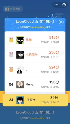 我们在 LeanCloud 成立五周年之际,发布了一款名为《LeanCloud 周年游戏》的微信小游戏。一方面我们希望通过玩游戏赢奖品的方式来回馈那些一直关注我们的用户,另一方面我们还希望通过一个实际的项目来讲明白 LeanCloud Play 在游戏开发方面的专长。