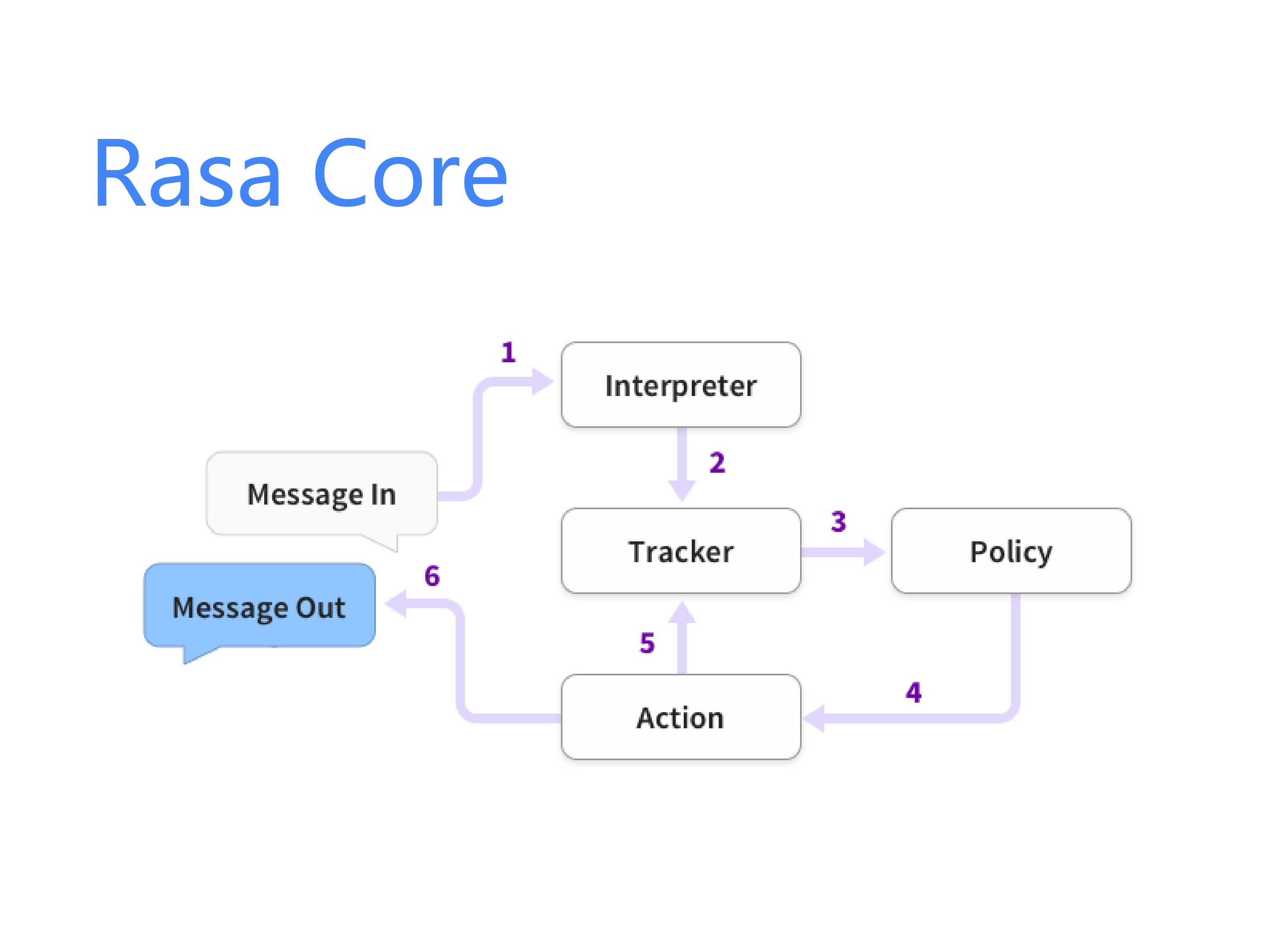 RASA Core则是一个对话管理体系,如下图所示,图中的每一个箭头都代表数据的流动。