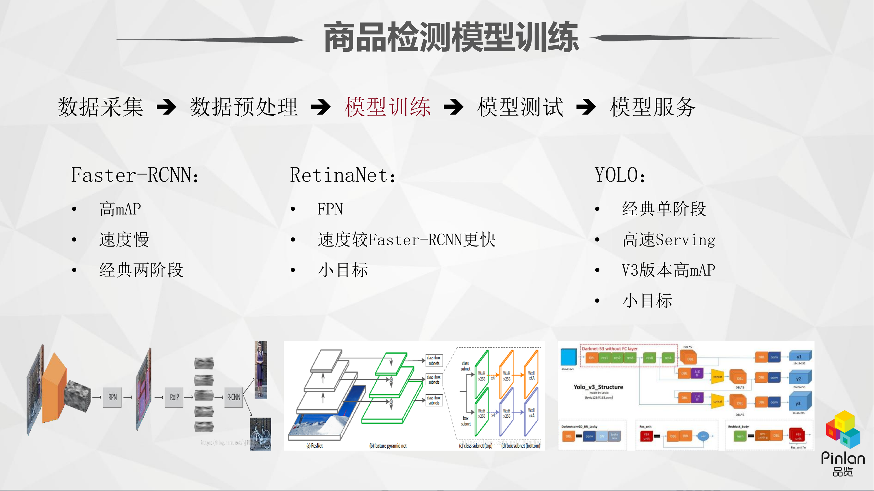 在商品检测模型训练的阶段,目前前沿的算法框架包括 Faster-RCNN、RetinaNet和YOLO等。