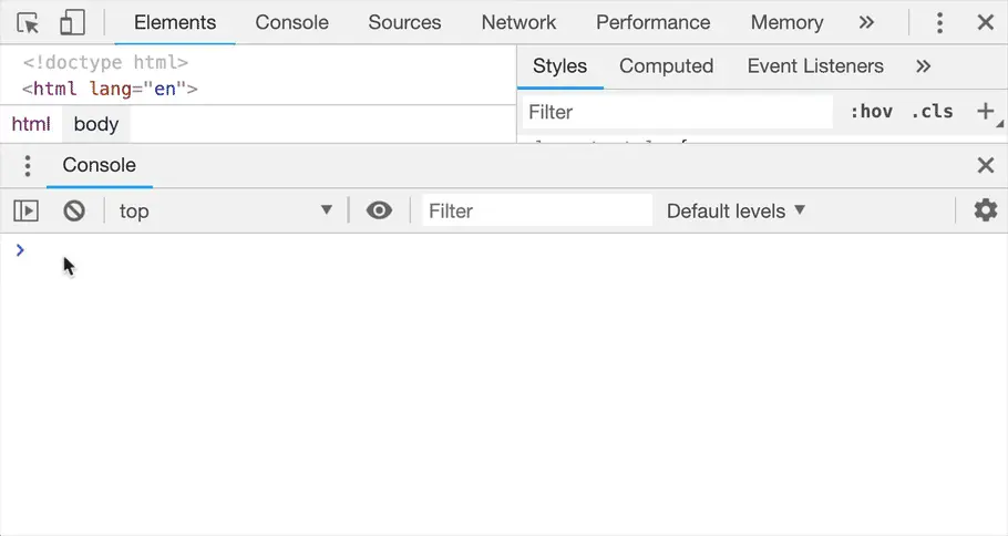 默认情况下,你会看到一个 console 选项卡。 这与主面板的 console 完全相同。 这就是为什么它(主面板)会显示除了 console 之外的每个主要标签( Elements ,Sources ,Network ...)- 这里显示(Console)没有实际意义。