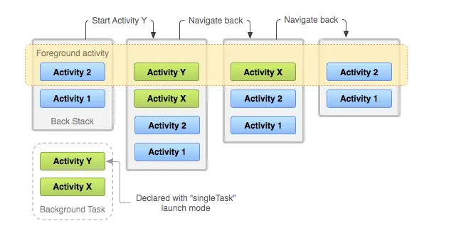 我们需要知道的是1.任务和返回栈遵循后进先出原则。2.打开或者退出一个activity任务栈都会相应的增加或者减少一个activity实例,任务栈被用来有序的管理这个哪个activity可以与用户交互,只有栈顶的activity才能与用户进行交互。3.在我们退出应用程序时,必须把所有的任务栈中所有的activity清除出栈时,任务栈才会被销毁。当然任务栈也可以移动到后台, 并且保留了每一个activity的状态. 可以有序的给用户列出它们的任务, 同时也不会丢失Activity的状态信息。4.一个应用可能有多个任务栈,一个任务栈也可能是多个应用activity的集合。5.返回键返回的大多数情况下都是返回到上一个activity,有种特殊情况,如果activity设置 了singleTask并且启动的是另外一个应用程序中的Activity,这个时候当发现该Activity正好处于一个后台任务当中的话,就会直接将这整个后台任务一起切换到前台。此时按下返回键会优先将目前最前台的任务(刚刚从后台切换到最前台)进行回退,具体看下图(Android Docs):
