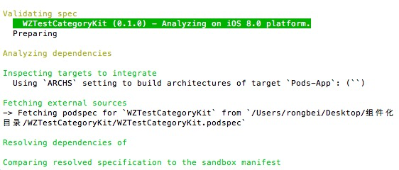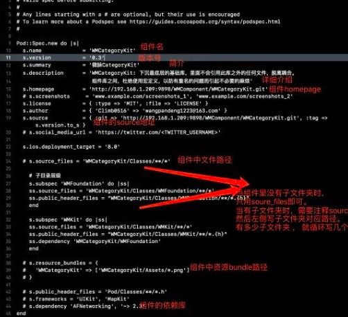 把刚才拖入到classes里的代码pod进来看看是否报错,编译通过后需要修改podspecs索引文件,一般需要修改下面几个问题: