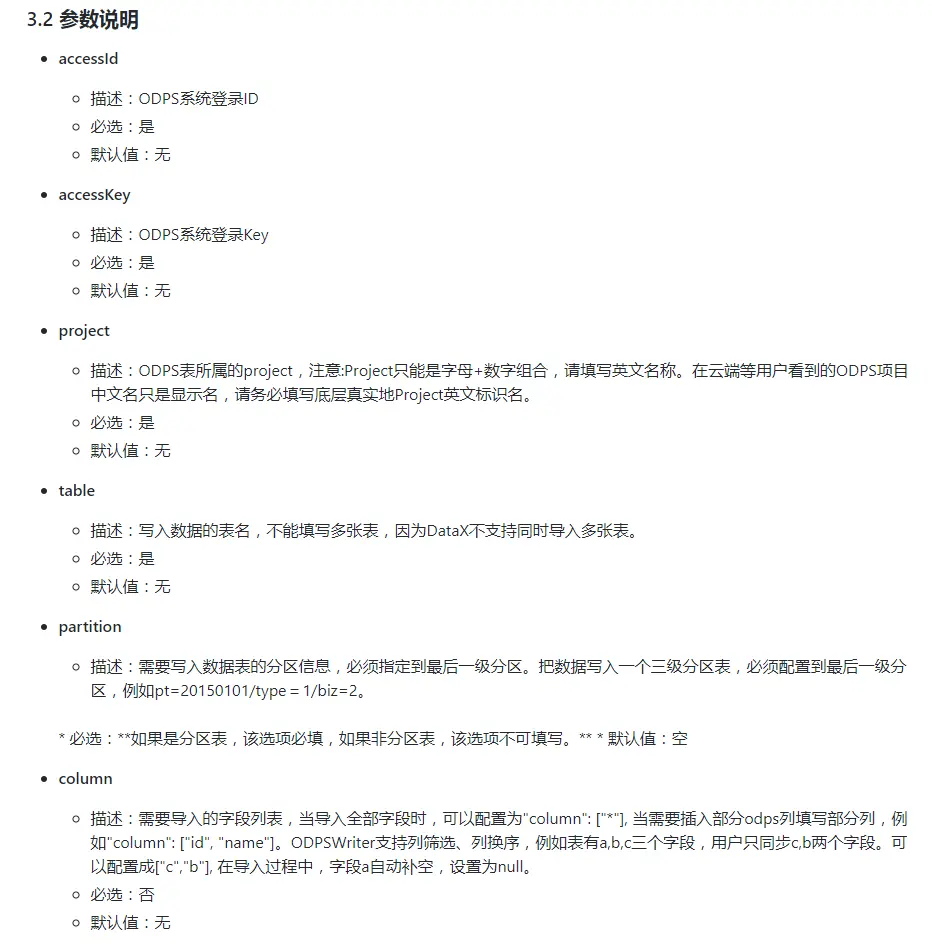 通过 python datax.py -r mysqlreader -w odpswriter 得到给出的json配置模板