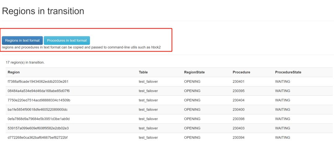 因为我们最后是希望通过HBCK2来进行处理,那么最好是可以复制粘贴需要处理的region或者procedure, 所以可以点击圈出的这两个按钮,会以text形式展示所有region或者所有procedure。