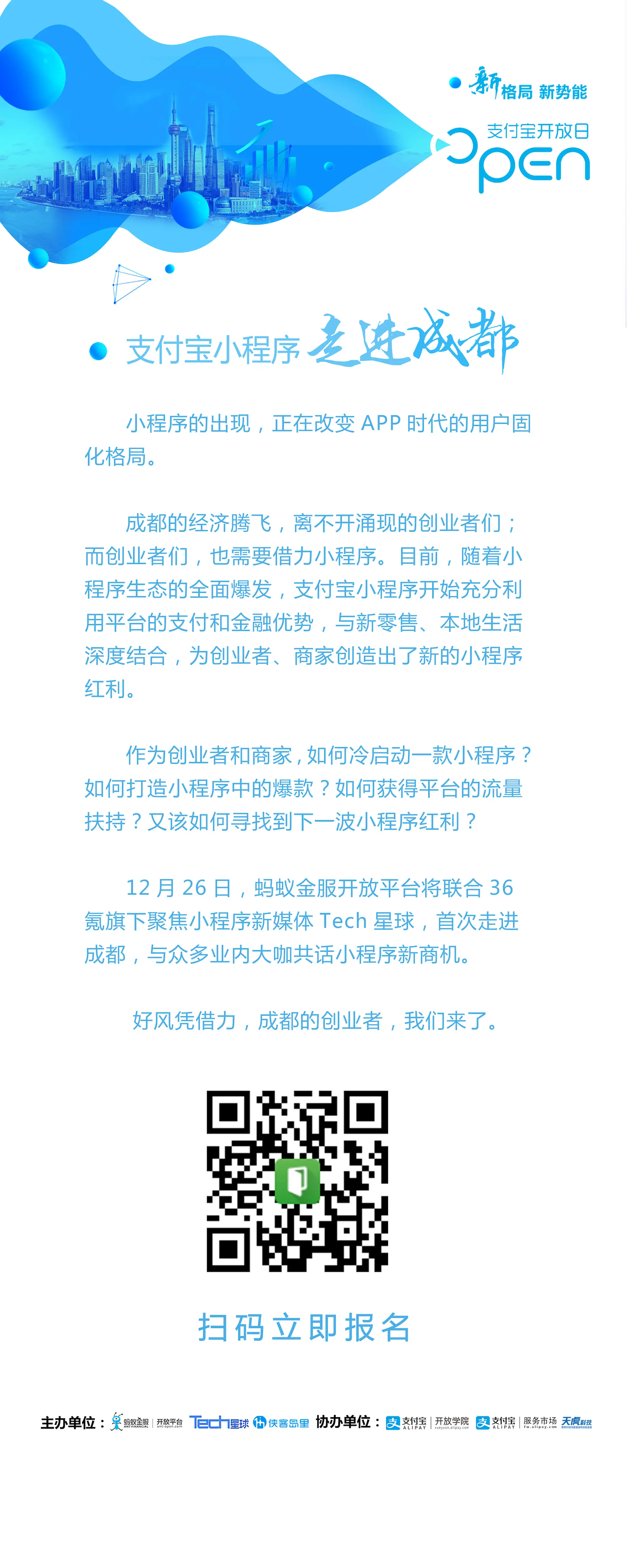 12月26日下周三下午,蚂蚁金服开放平台联合华西都市网旗下天虎科技、36氪、走进成都航天科技大厦,和蚂蚁金服高级专家、业内大佬和知名投资人,为大家揭秘小程序中蕴含的商机,深度解读小程序红利,满满干货不容错过!现场更有阿里定制伴手礼、千元红包放送~