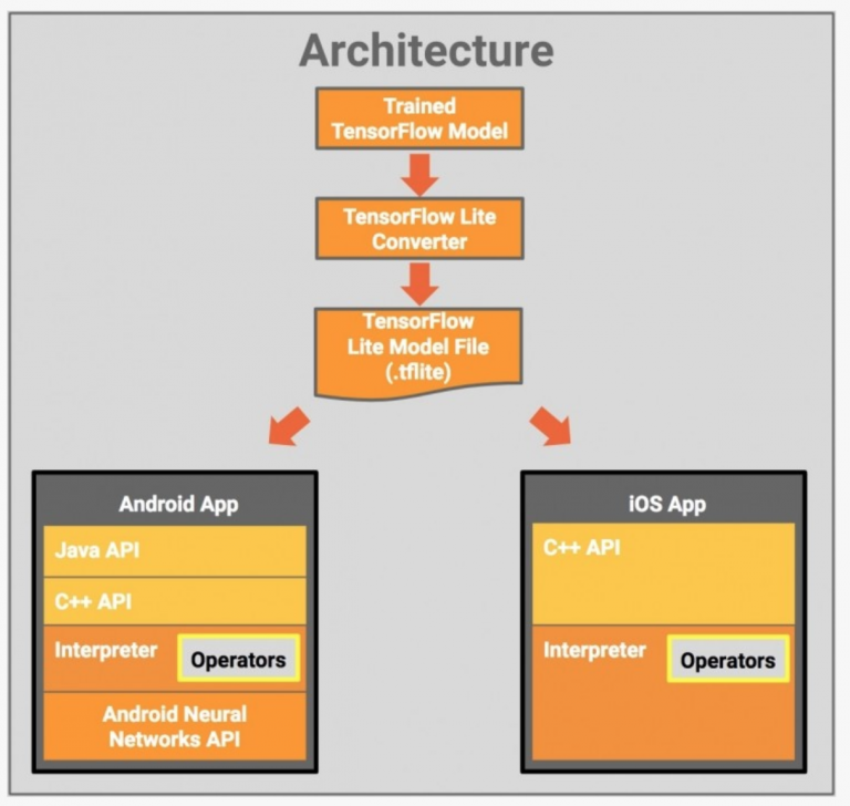- C++ API: 加载 TensorFlow Lite Model File,调用解释器(Interpreter)。 上面的这两个库在 Android 和 iOS 端都可用。