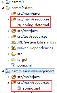 将之前ssmm0-userManagement中类路径(src/main/resources)下的spring.xml切分成spring.xml和spring-data.xml两个文件,其中spring.xml依旧留在ssmm0-userManagement中类路径下,而spring-data.xml放到ssmm0-data的类路径下,切分后的位置如下图所示: