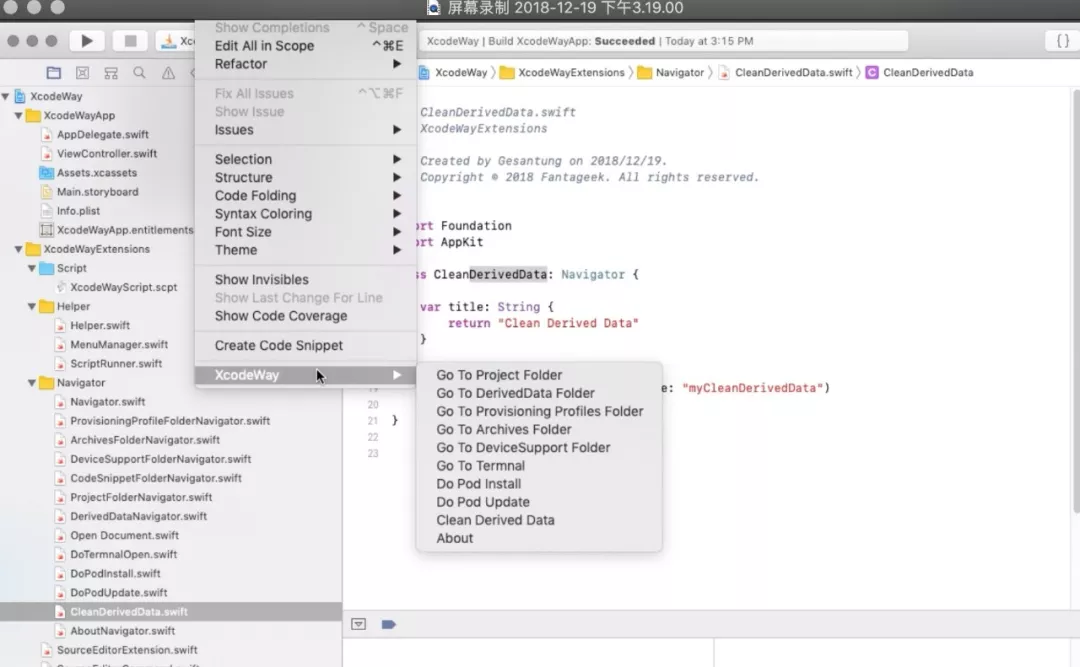 说下XcodeWay的制作原理吧,我们知道Xcode Extensions目前局限于操作Xcode当前选中的文件,比如给当前文件添加注释,对当前文件做Code Lint等等,XcodeWay是怎样实现一键Pod Install,一键清除DerivedData这样的功能呢?