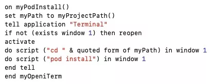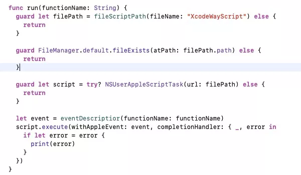 XcodeWay fork自onmyway133,之前作者提供的功能比较单一,就是打开各种目录,我站在大佬额肩膀上做了下修改,支持了Pod操作,文件删除操作,模拟器删除操作(要知道用了几年的Xcode模拟器可能会有20多g),主要原理是通过Extensions执行AppleScript脚本(这货大概都懂吧,之前的文章也说过),在脚本中实现各种文件的操作,各种应用的唤起如唤起终端,关键代码如下: