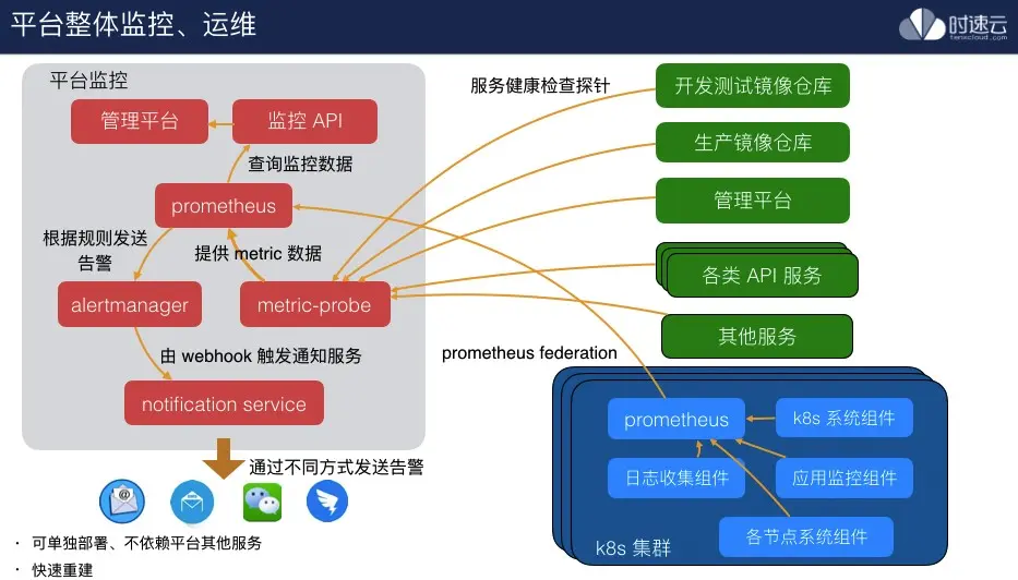 同时,对于整个平台的监控、运维,我们开发了一个独立的、易于部署的监控平台,用来对开发测试镜像仓库,生产镜像仓库、PaaS 平台、各类 API 服务、K8s 集群及其核心组件、各节点组件等进行统一状态收集,可以监控相关服务的状态,也可以对历史状态和异常情况进行回溯,从整体上考量每个组件的服务质量。