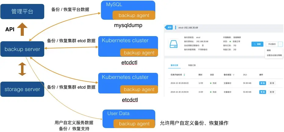 对于平台的运维,当然也要考虑到对数据的备份和恢复,以便在某些场景下对数据进行回滚操作。我们的容器 PaaS 上也提供了平台、集群相关的数据定时备份及恢复管理,可以把平台的 MySQL 数据及每个集群的 etcd 数据进行统一管理,也允许接入自定义备份源,实现对数据的统一管理。