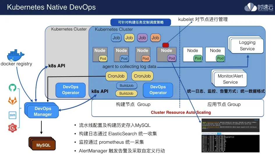 整体 DevOps 平台的基本架构如下,通过自定义 CRD 和 operator 来对构建任务进行管理,日志的收集、监控告警、节点管理、构建资源的伸缩、配额管理、权限控制都可以同PaaS 层的能力相一致,同时可以利用 PaaS 上的 Pod、Job、CronJob、Volume、ConfigMap、Secret 等诸多资源的能力,在持续集成、持续交付、持续部署等方面进行创新。未来 PaaS 层的新功能、功能改善,都可以直接适用于 DevOps 平台,大大降低了 DevOps 的开发和运维成本。