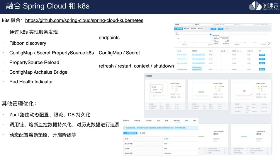 在 Spring Cloud 和 K8s融合方面,可以使用 Spring Cloud开源的依赖项目,使用 K8s自身的服务发现、配置管理等相关能力;同时为了方便管理运维,我们将 Zuul 的路由配置使用数据库进行持久化,将 Zipkin 的调用链数据和 Hystrix 的熔断监控数据分别进行了持久化,以便随时对历史数据进行回溯;也可以直接在微服务治理平台上动态配置熔断策略或者开启降级操作。