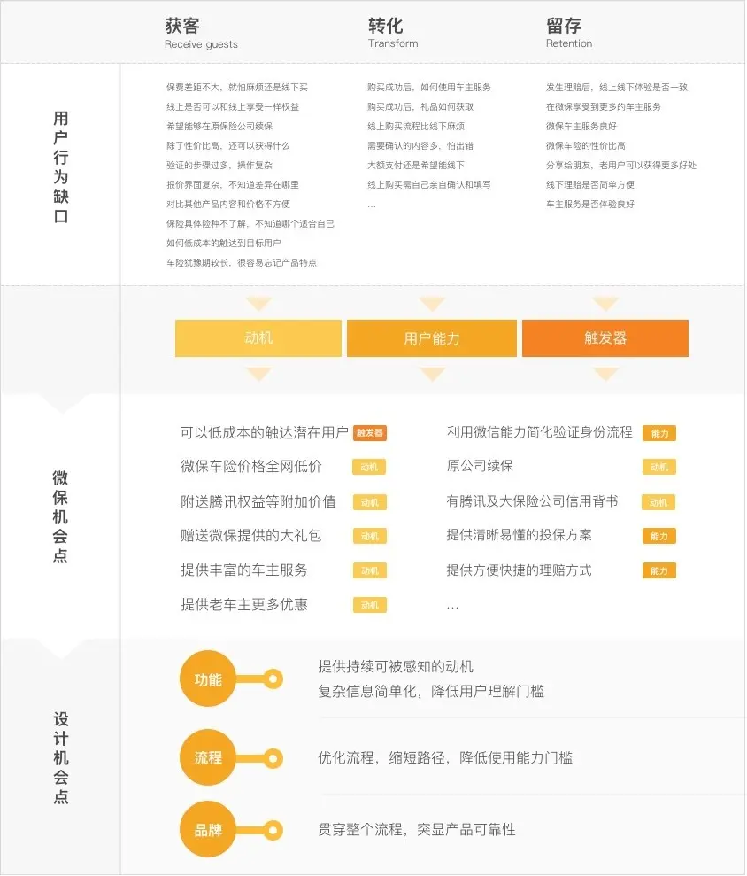 有了这些用户需求后,我们根据不同阶段的目标,将产品周期分为“获客”-“转化”-“留存”三个阶段。围绕这三个阶段确定影响车主转化的潜在用户关键行为内容。例如,在获客阶段,保费的价格是影响用户最重要的动机,其次是理赔服务、礼品、品牌等。通过梳理用研报告,我们将影响用户行为的缺口进行了汇总。