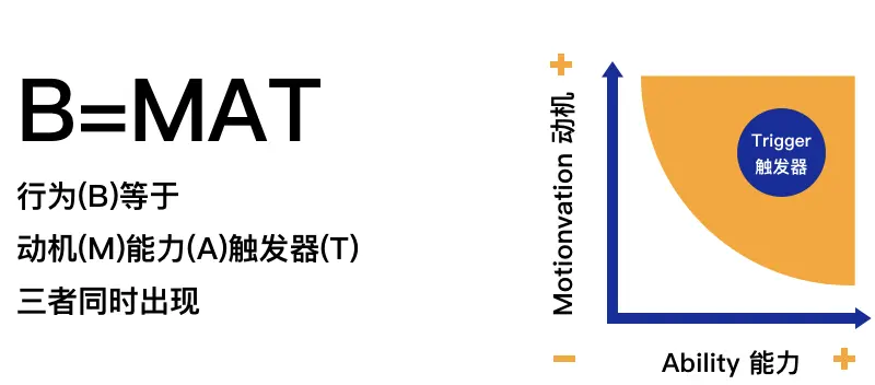 我们了解到任何一个人的行为都是因为个人的特定人格和他所处情境共同作用的结果。因此我们所做的行为并不完全是自己主动选择的,而是在社会情境和个人因素的双重作用下产生的。心理学家福格教授提出影响行为发生的模型,他指出“如果需要用户改变行为习惯,要有三个要素”并且用一个等式来简化了模型:
