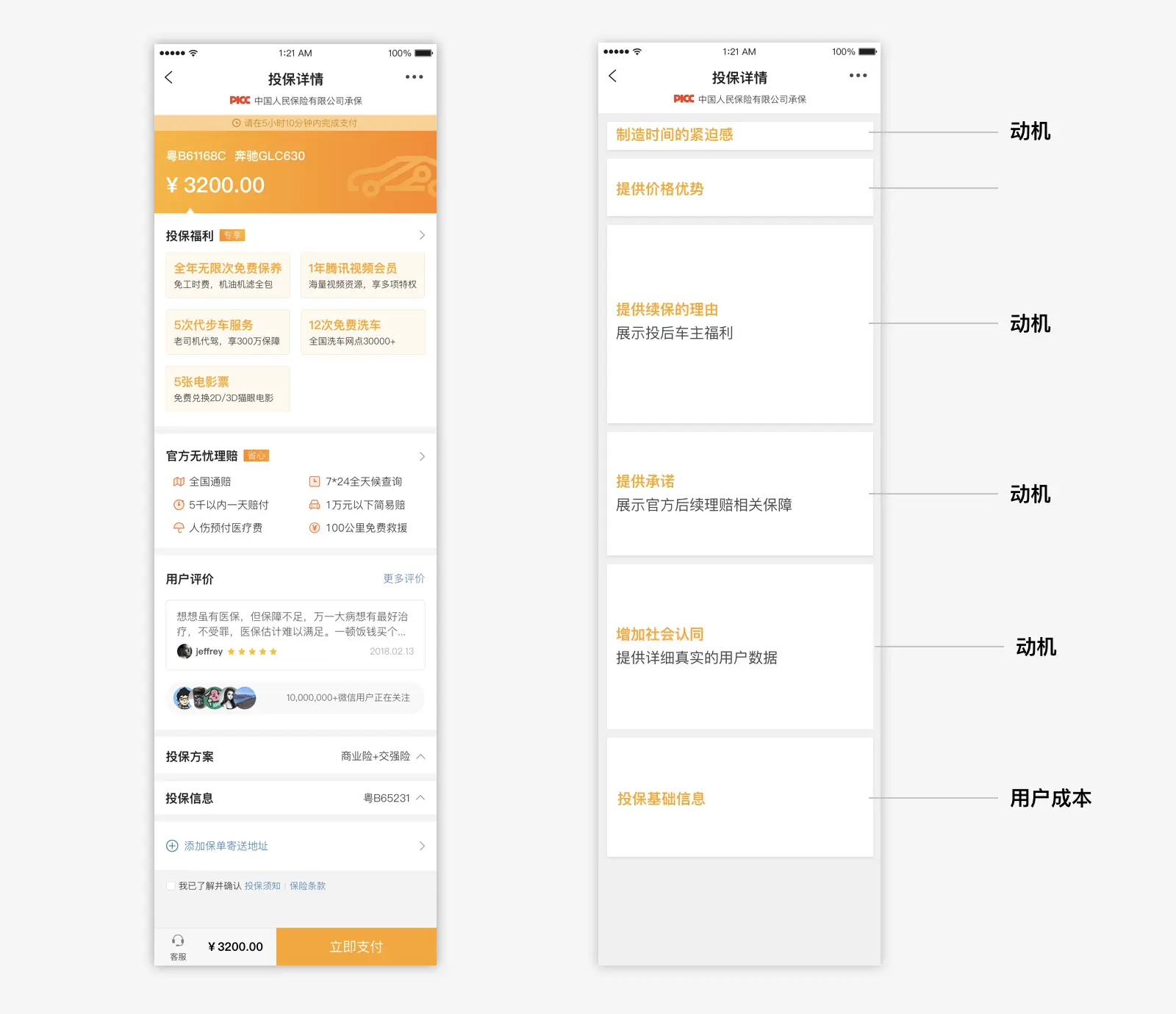 当用户进入订单详情后,虽然转化的机率很大,但是用户还是有可能流失,这里需要给用户提供持续的动机,促进转化。我们发现市面上车险价格的差异主要是提供的车主福利不同。用户作为老司机,在同家公司续保每年的车险投保不会有太大的变动,基本上很稳定。所以除了价格之外,车主福利也是我们需要突出展示的。由于不同价格返回的礼品不一样(由于相关保险政策,不宜展示具体礼品金额)在方案详情页上,我们会突出礼包方案以及相关特色服务,并且在礼包信息部分,设置了调整礼包品类的入口,便于用户对礼包的调整,通过礼包的吸引用户最终转化。