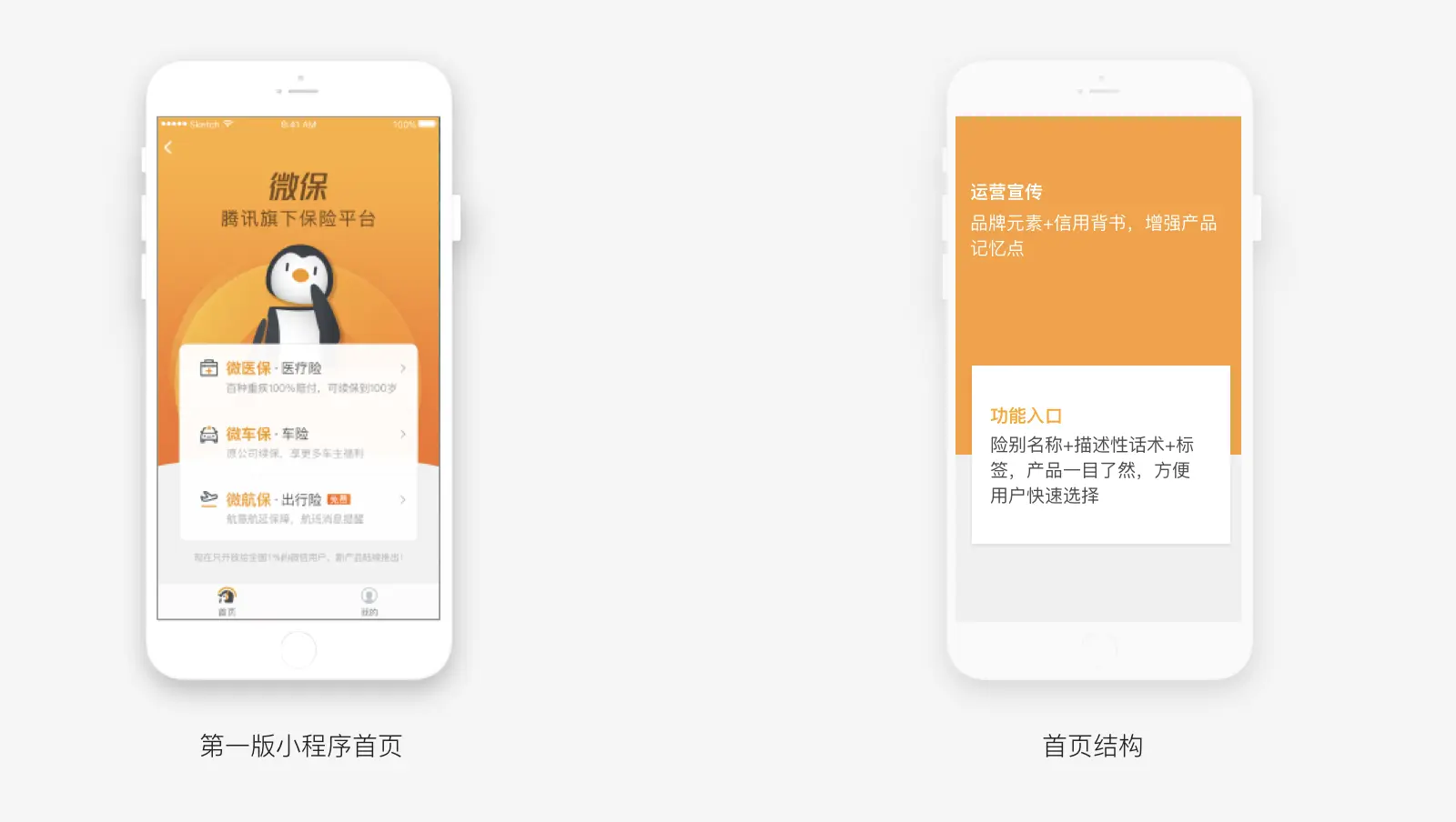 品牌是用户首次接触全新产品时的重要记忆点。结合信用背书,让二者产生连接,增强产品的可信度。在不同的场景下重复的曝光,强化形象在用户心中的建立。第一版首页设计,通过大色块对比的方式,突出品牌吉祥物,引导关注头部信息,让用户明确感知微保与腾讯之间的关系,增强选择下面部分产品入口的入感。