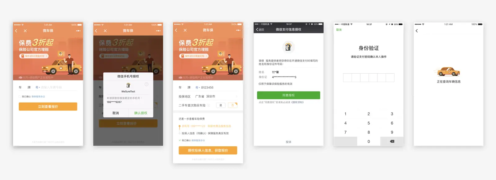 如图所示,这么多的步骤一定会影响到车险的购买转化率,这里转化率更多的是因为用户的能力决定的。我们和产品一致都认为在这里一定要尽可能降低用户的能力门槛,利用一切可利用的技术,例如利用微信本身的身份验证体系进行验证,然后再用验证得到的身份信息和保险公司留存的脱落、续保大数据匹配。减少用户的输入时间和人力成本。同时,微信账户体系的运营也能增强用使用的安全感。