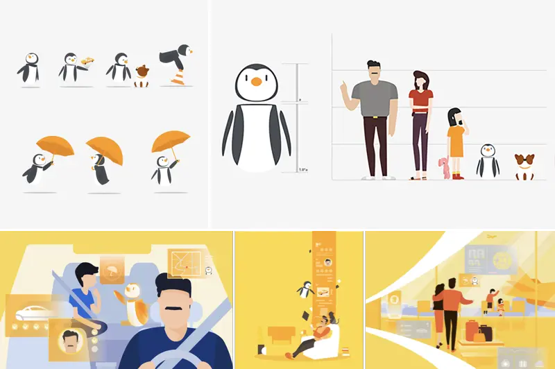 吉祥物是除logo以外能够强化用户对品牌记忆的一个重要因素。在产品详情介绍、运营等场景下使用插画的方式,将吉祥物结合到其中,帮助用户理解产品、活动内容的同时能够感知到“微保”品牌的印象。再此情况下,标准化输出吉祥物形象,在用户能够保持一致的形象感受。设定了标准造型的基础上对其它人物、场景风格进行了探索。通过概念稿的方式,确定产品平台插画的设计风格,保障不同设计师在协同合作过程中能够有较为一致的风格输出。