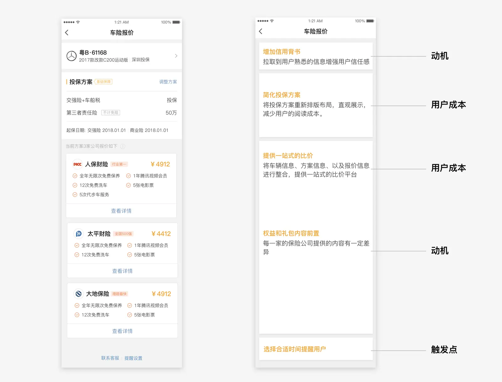 产品从0到1不断完善是一个过程。当我们对目标群体诉求有了一定的了解,找到了提高车险行为转化的机会点后,挑选出适合现阶段的机会点,并将其转化成设计机会点,确立设计方向后就针对性的开展我们的设计了。