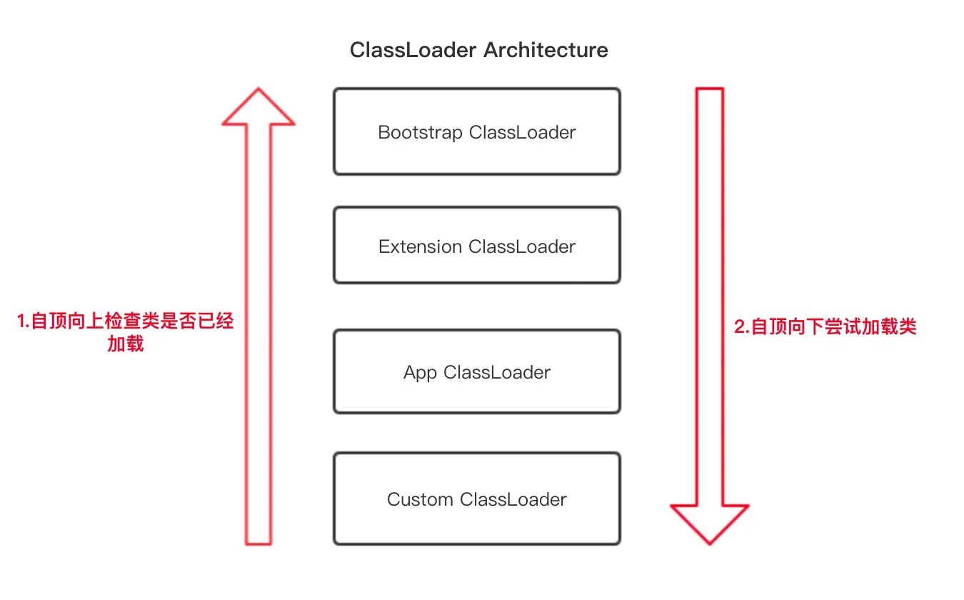 底向上检查类是否被加载,一般情况下,首先先从AppClassLoader中调用findLoadedClass查看是否已经加载,如果没有加载,则会交给父类,ExtensionClassLoader去查看是否加载,还没加载,则再调用其父类,BootstrapClassLoader查看是否已经加载,如果仍然没有,自顶向下尝试加载类,那么从 BootstrapClassLoader到 AppClassLoader依次尝试加载。