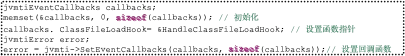 假如我们需要某个类的字节码文件读取之后,类定义之前能修改相关的字节码,从而使创建的class对象是我们修改之后的字节码内容,就需要写一个HandleClassFileLoadHook函数,然后在Agent_OnLoad函数里为jvmtiEventCallbacks设定对应的函数指针。