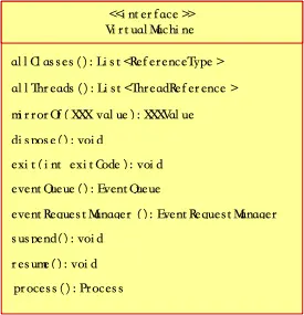 VirtualMachine接口继承自Mirror接口,JDI中几乎所有其他接口都继承于它。镜像机制是将目标虚拟机上的所有数据、类型、域、方法、事件、状态和资源,以及调试器发向目标虚拟机的事件请求等都映射成Mirror对象。例如,在目标虚拟机上,对象实例被映射成ObjectReference镜像,基本类型的值(如float等)被映射成PrimitiveValue(如FloatValue等)。被调试的目标程序的运行状态信息被映射到StackFrame镜像中,被调试的目标虚拟机则被映射成VirtualMachine镜像等。调用Mirror实例virtualMachine()可以获取其虚拟机信息