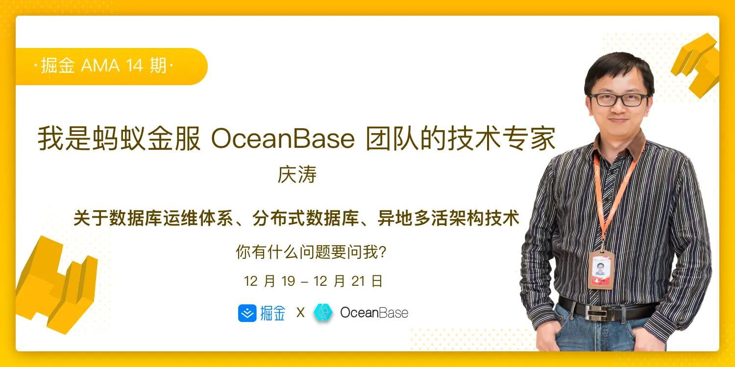 第十四期 AMA,掘金团队请来了蚂蚁金服 OceanBase 团队的技术专家-- OB庆涛做了为期三天的 Ask Me Anything (AMA) 活动(活动已结束)。