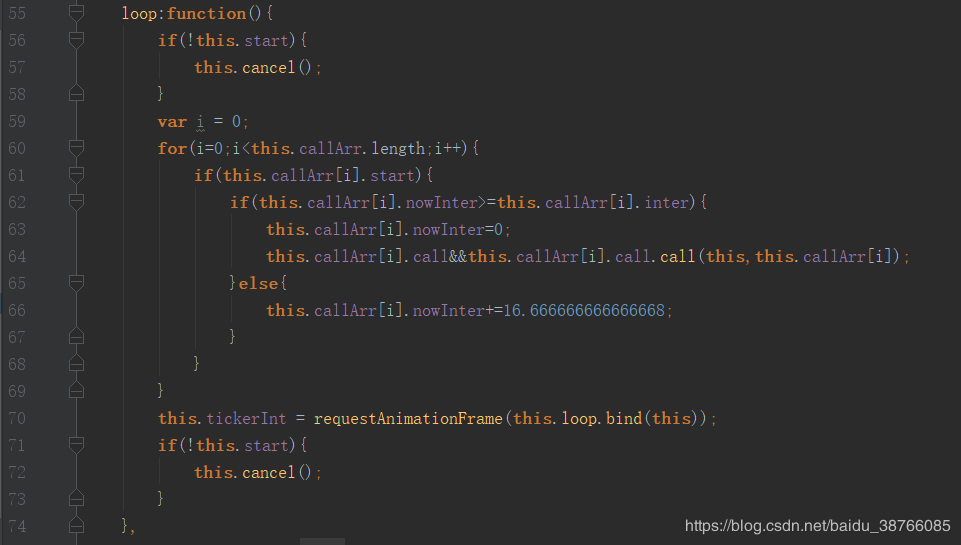 在这个方法里面我们先判断我们的计时器是否是启动的如果是启动的我们就不做操作如果不是启动的我们就调用取消计时器的方法再然后我们循环调用每一帧的韩素华 并且进行时间间隔判断