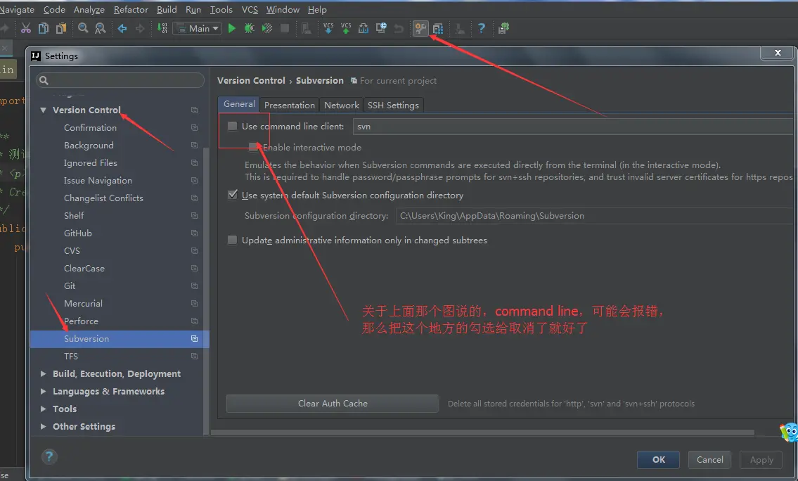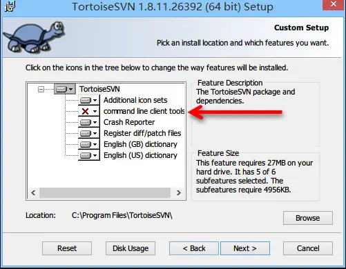 如上图箭头所示,在安装 TortoiseSVN 的时候,默认 command line client tools,是不安装的,这里建议勾选上。
