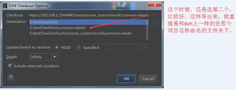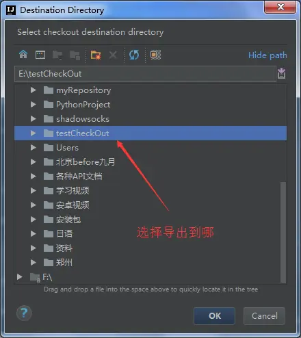 (我这地方取名字叫testCheckOut,一般你们本地可能新建个文件夹用来存放各个项目,就比如叫workspace吧,那么这个文件夹下面,就会存放项目1,项目2,,,很多个,那么下面这个图就应该选第二个,然后,导出来的效果就是在workspace下面会有n个项目目录,各自是各自,互不干扰。)