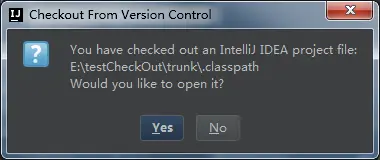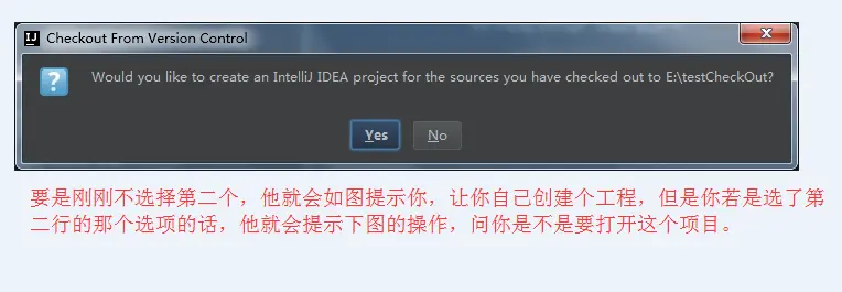 理论上导出操作完之后,会自动打开刚刚导出的项目,然后再下一步操作,但是有时候,也会出现上面这个图,估计是自动创建失败,这个时候,就的手动操作一下,他的意思就是,从一个已经存在的项目也就是你刚刚check out的项目,创建一个intelliJ idea项目。这个也是可以继续操作的。你点yes,然后继续选maven,选pom选啥的