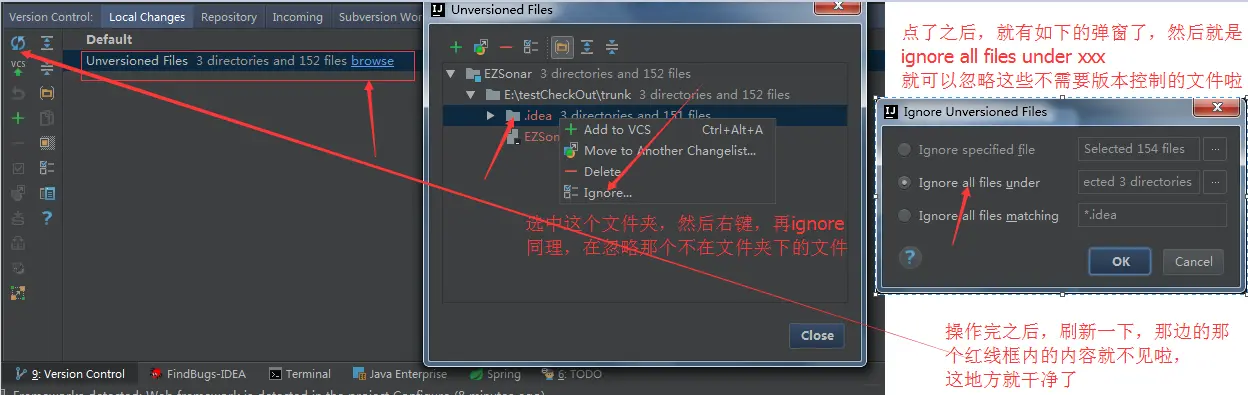可以看到都是在.dea文件夹下的一些文件,这些文件是不需要版本控制的,也不需要显示在这local changes一栏的。所以,你选中这些多余的文件,然后ignore掉就可以啦。