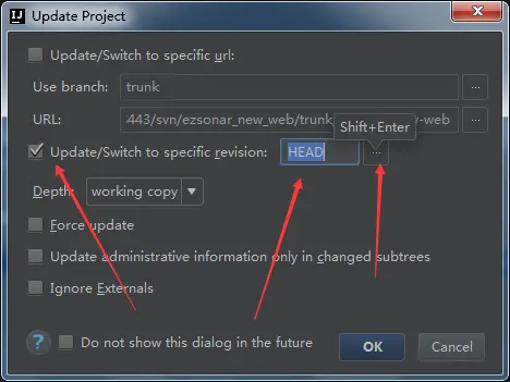对勾打上,现在看到的后面的是head也就是最新的,或者,以前,我这就没选,那默认就是更新全部嘛。现在可以点击第三个箭头所指的地方,然后选择你要更新到哪个版本号,然后就可以啦。剩下的就不详细描述啦。