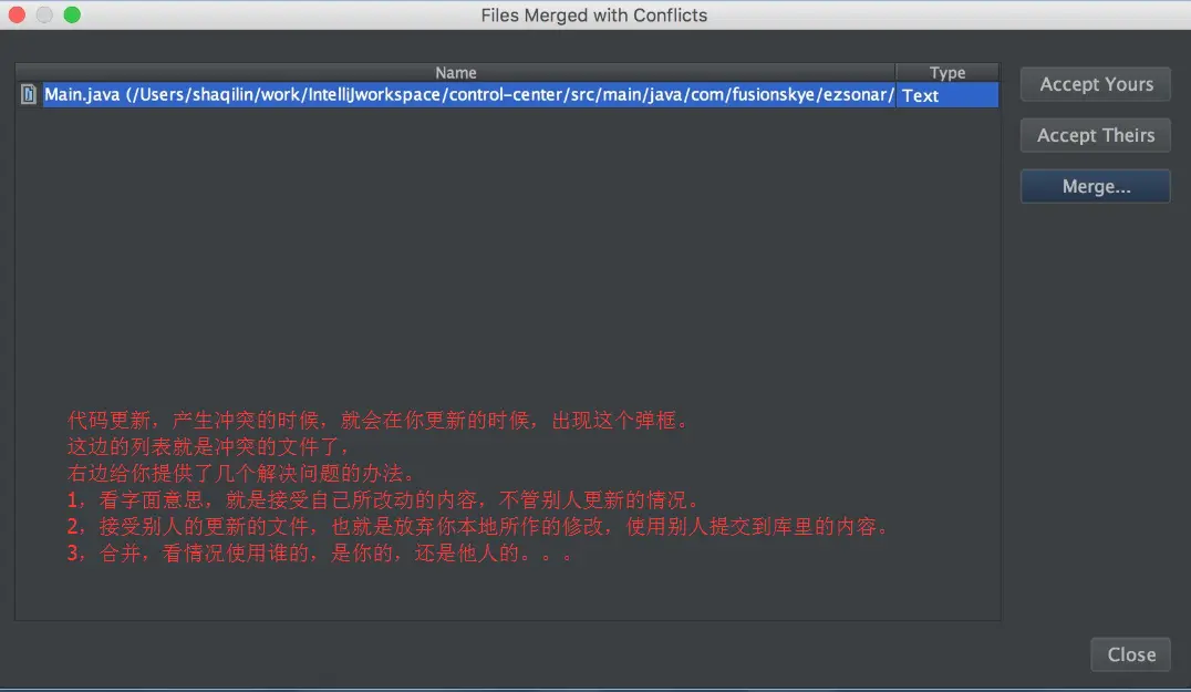 要是,你一本正经的在完成你的任务,但是你的同事却凑巧也修改了你正在修改的文件,而且他还先你一步提交了,废话,要不然,解决代码冲突的事情,就是他来干啦。这个情况下,就得考虑合并了,也就是对应上图的merge按钮啦。