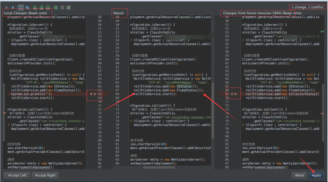 所以,你要把这些都变更,冲突,都处理完啦。最后,点apply,这之后,就算是合并冲突完事儿啦。