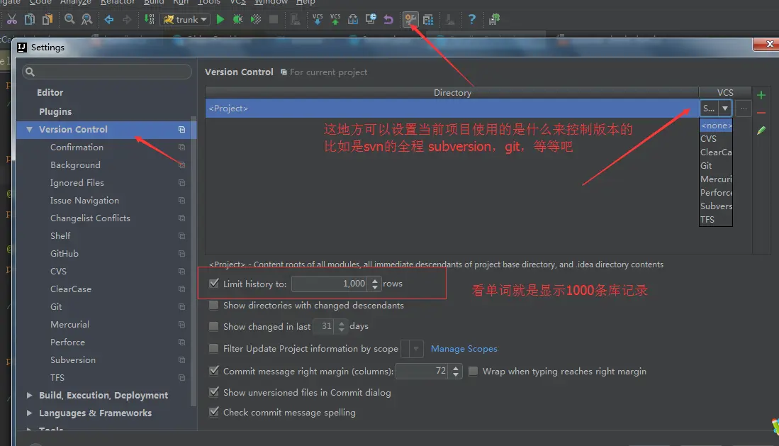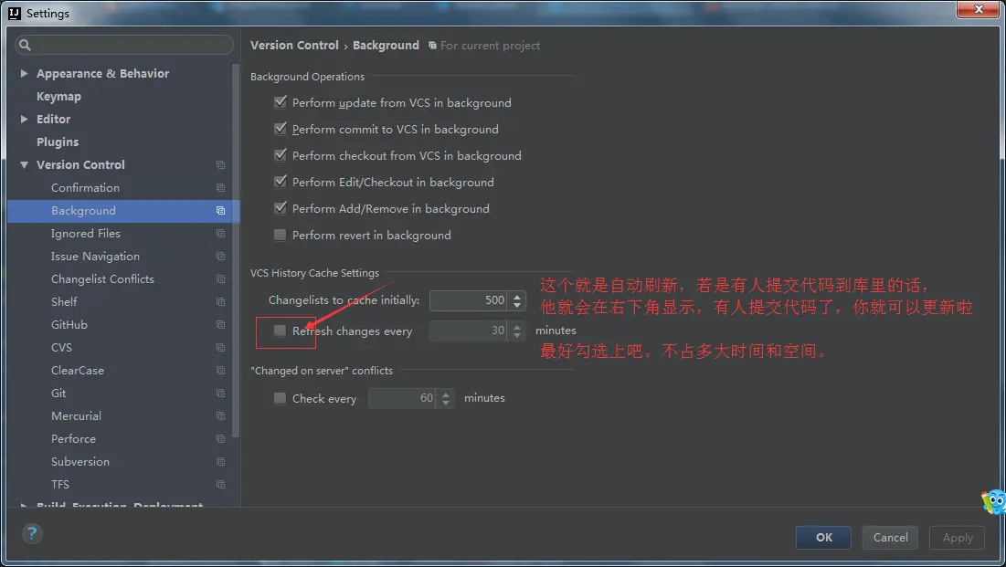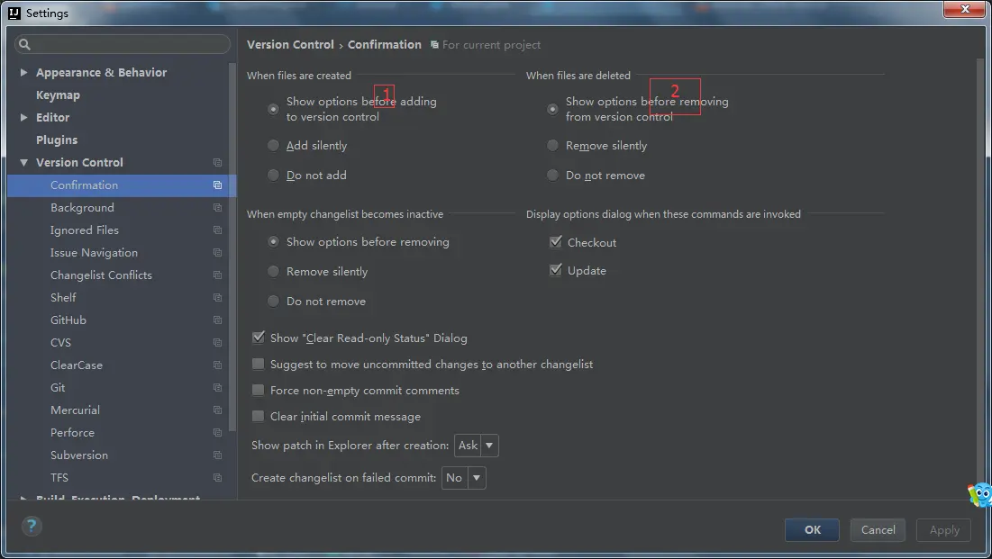When files are created表示当有新文件放进项目中的时候 IntelliJ IDEA 做如何处理,默认是Show options before adding to version control表示弹出提示选项,让开发者决定这些新文件是加入到版本控制中还是不加入。如果不想弹出提示,则选择下面两个选项进行默认操作。 - 如上图标注 2 所示,