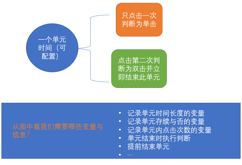 通过上述自定义地方式,实现了双击与单击的独立,当然还可以将时间间隔(单元时间长度设置为参数传入),更加灵巧。毕竟是手工实现,严格测试可能会有纰漏,正常的使用应该是没问题的,毕竟水平有限,不足之处还望读者朋友不吝赐教哦!
