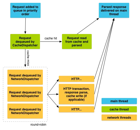 我们可以看到首先是请求添加到RequestQueue里,首先是添加到缓存队列,然后查看是否已经缓存,如果有并且在有效期内的缓存直接回调给用户,如果没有查找到,那么则需要添加到网络请求队列重新请求并且解析响应、写入缓存在发送到主线程给用户回调。