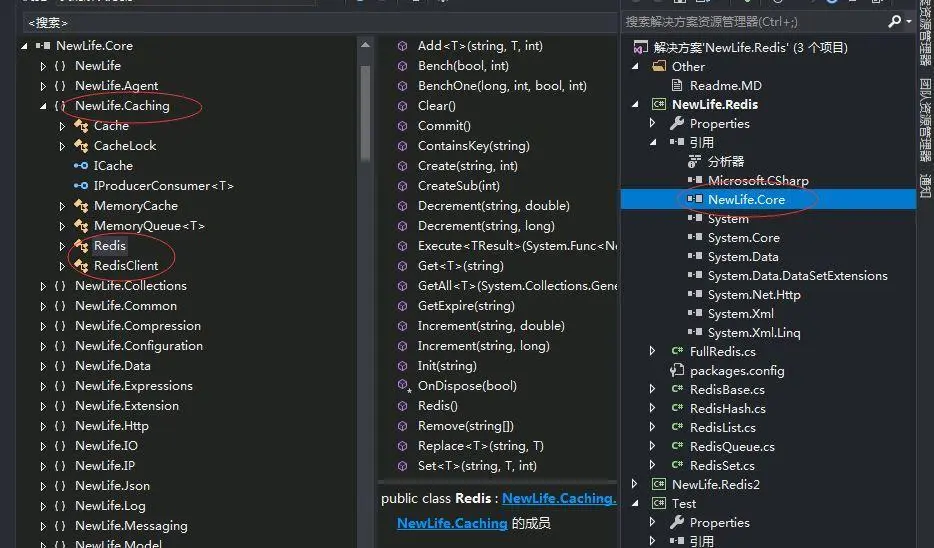 这里可以打开看一下,NewLife.Core里面有一个NewLife.Caching的命名空间,里面有一个Redis类,里面实现了Redis的基本功能;另一个类是RedisClient是Redis的客户端。