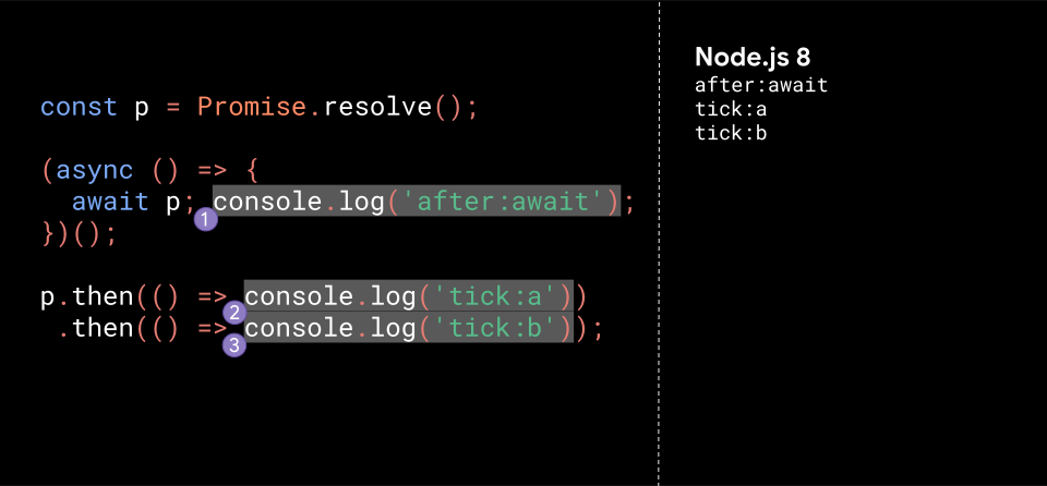 既然 p 的状态已经是 fulfilled 了,你可能会认为首先打印 'after:await' 然后再打印 'tick'。实际上,这是 Node.js 8 中的行为: