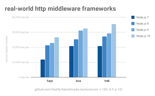上面的图表展示了一些流行的 HTTP 中间件及框架的性能,这些框架大量使用了 Promise 和 async 函数。请注意,此图表显示了每秒的请求数(requests/second),因此与之前的图表不同,这个图表中,柱状图越高表示越好。这些框架的性能在 Node.js 7(V8 v5.5)和 Node.js 10(V8 v6.8)之间得到了显着提升。